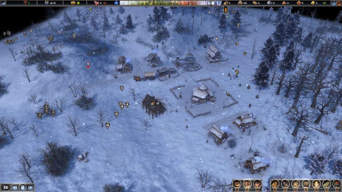 中央集会所を建てたら住居を3棟建設し近くには井戸を造る、そして薪割り場も建設。井戸には石が必要となるので近くにある石を採掘する。建物を建てる場所に木などがある場合はそれらを取り除いてから建設が始まる。もちろん伐採した木などは資源として使える。