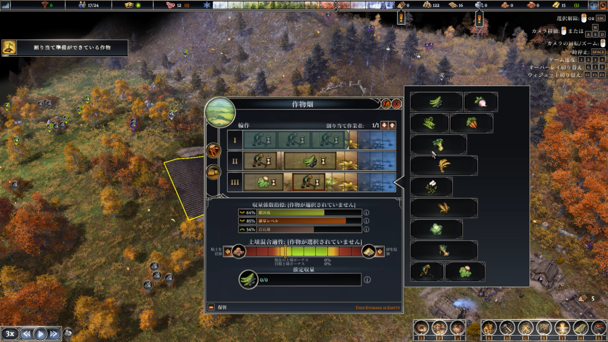 畑をつくる時は肥沃度と土の混合比が表示される。これらは収穫量に影響を及ぼすので育てたい作物と土の状態は知っておいた方が良いだろう。自分はあまり気にせず肥沃度だけみて畑を作ってしまうが。