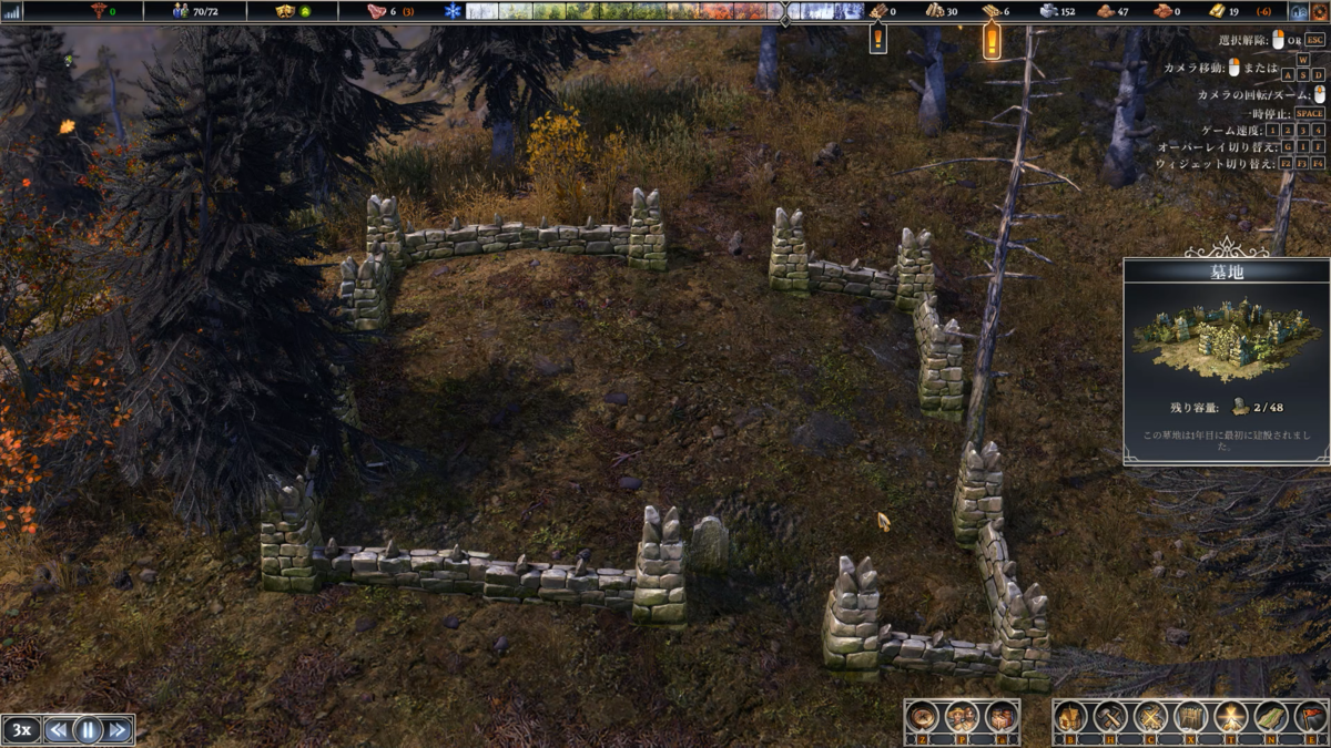 しばらくして墓の住民が死体を抱えて墓地に運んで行った。これでこの街の死者は2人となった。難易度高めなはずなのだけどなかなか人は死なないな。資源が豊富なマップだからかもしれない。難易度の設定よりもマップが難しさに直結するのかな?