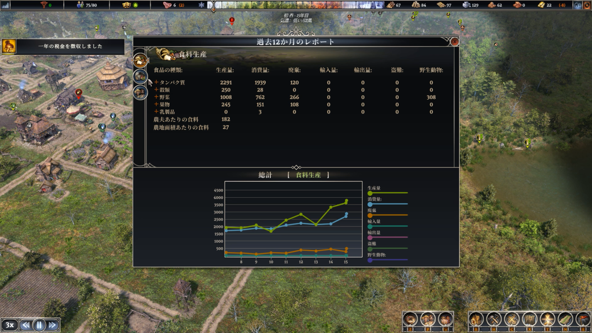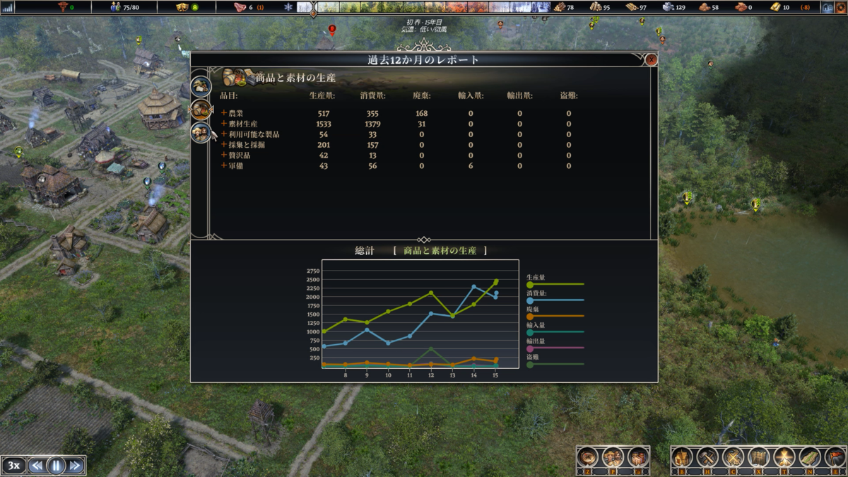これは素材生産の報告書。こっちも消費量より生産量が多め。素材は腐って破棄するというものが少ないのでどんどんストックできる。だが、人口が増えていけば消費量も増えるのであまり気が抜けない。