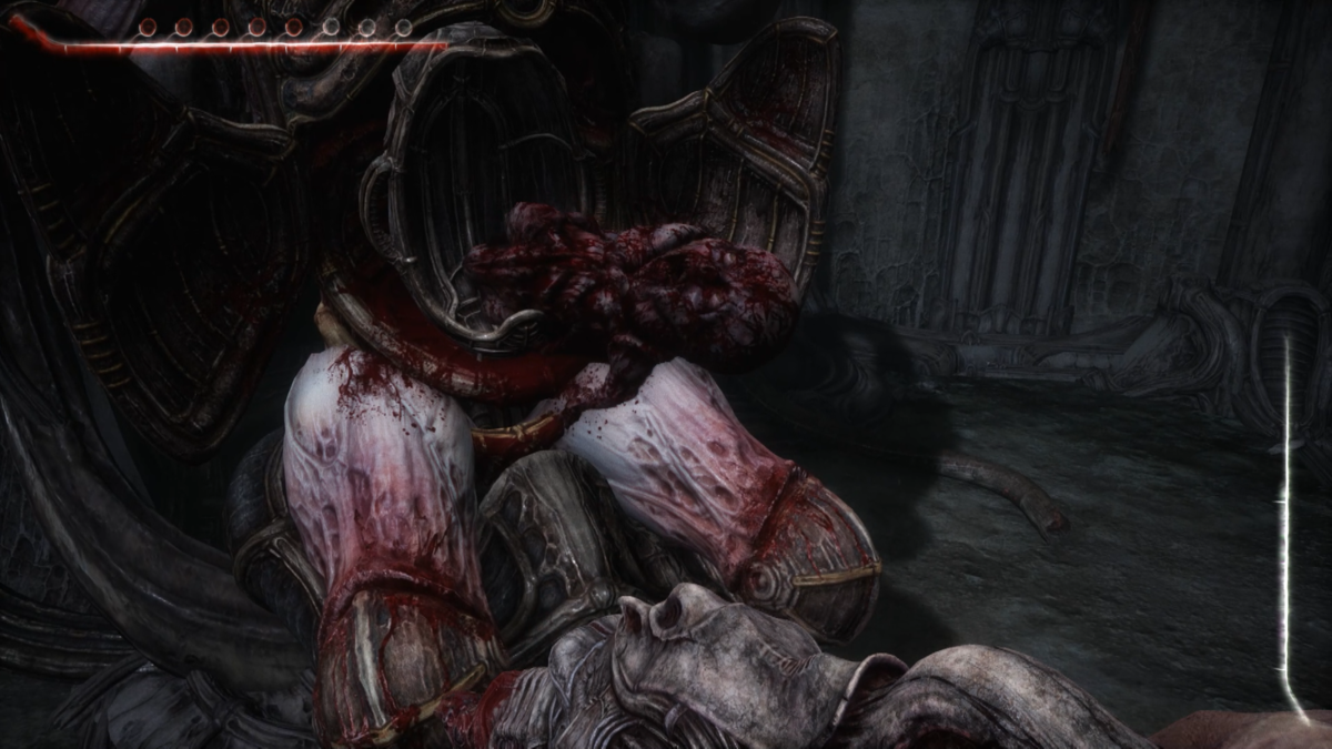 グレネードランチャーを数発撃ちリロードを始めると、背中に背負っているものの脇から赤黒いドロっとしたものが出てくるのでそれを攻撃すればダメージが入る。