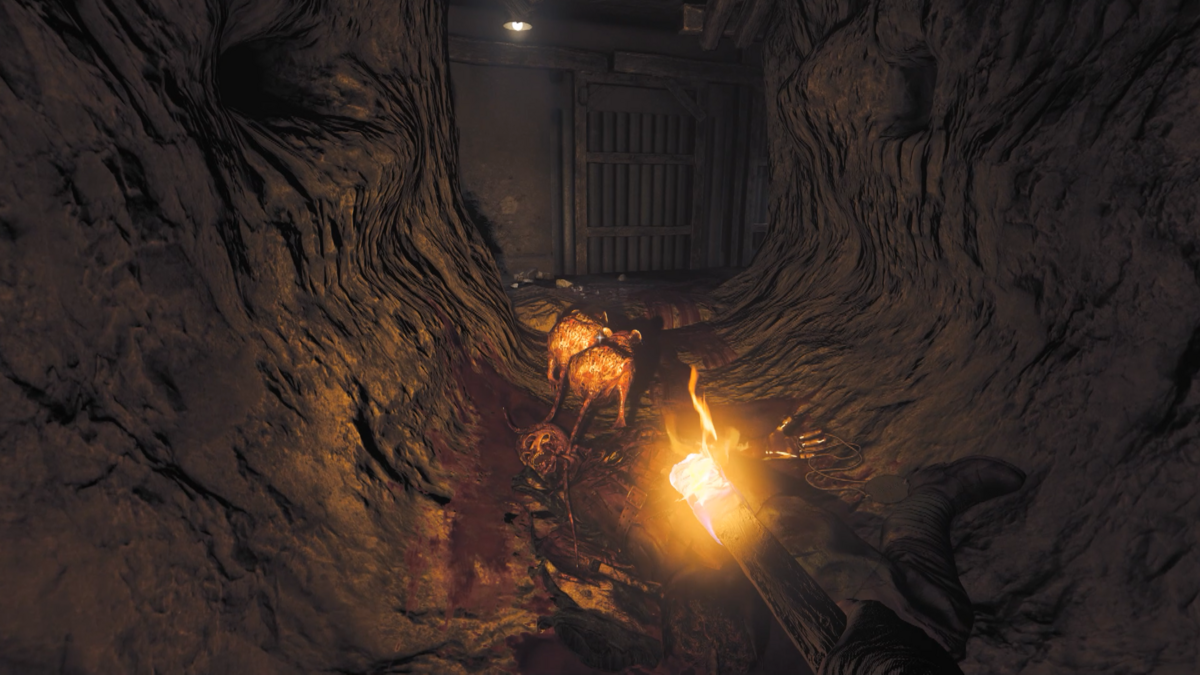 発煙筒が燃え始め、床に溜まっていた燃料に引火。大きな炎となり道を塞ぐ。