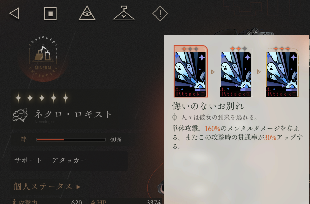 キャラの名前の左にあるアイコンや神秘術の説明文でそのキャラがどちらのダメージを与えるキャラなのか確認できる。例えばネクロ・ロギストはメンタル。