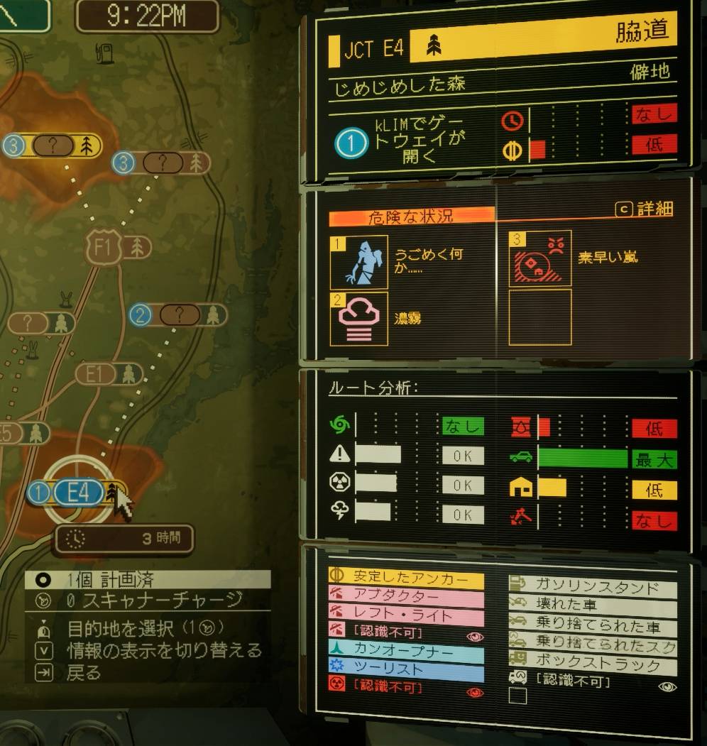 マップ上のE4はジャンクションで、そこまでの道のりは一般道。E4からの脱出に必要なアンカーの数は1つと読み取れる。